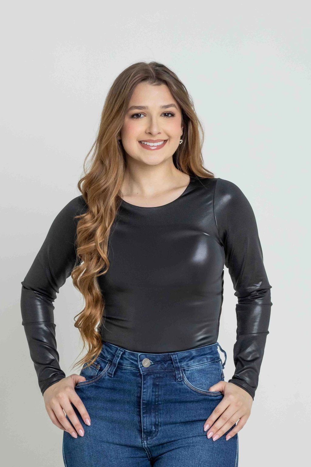Seu acabamento brilhoso confere um toque elegante e moderno, ideal para composições que vão do casual ao mais elaborado. Seja combinado com saias, calças ou shorts, este body valoriza a silhueta e traz personalidade ao look com muito estilo.