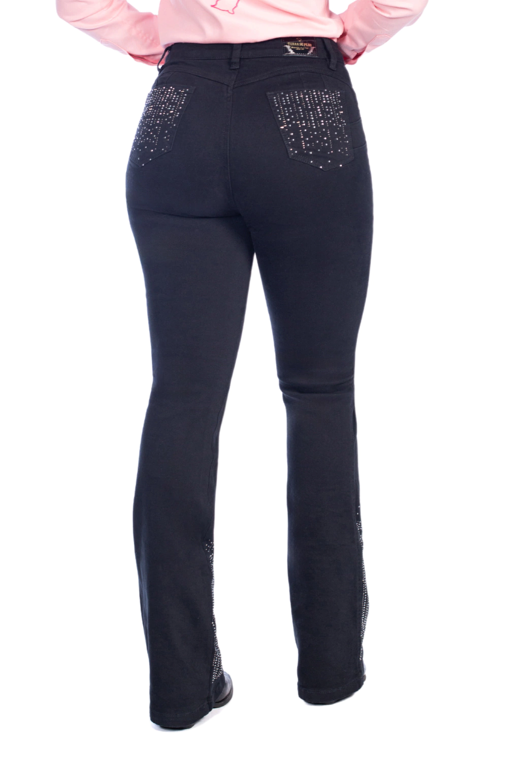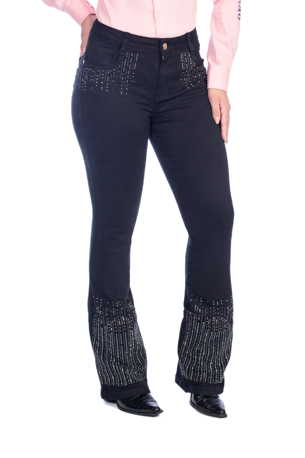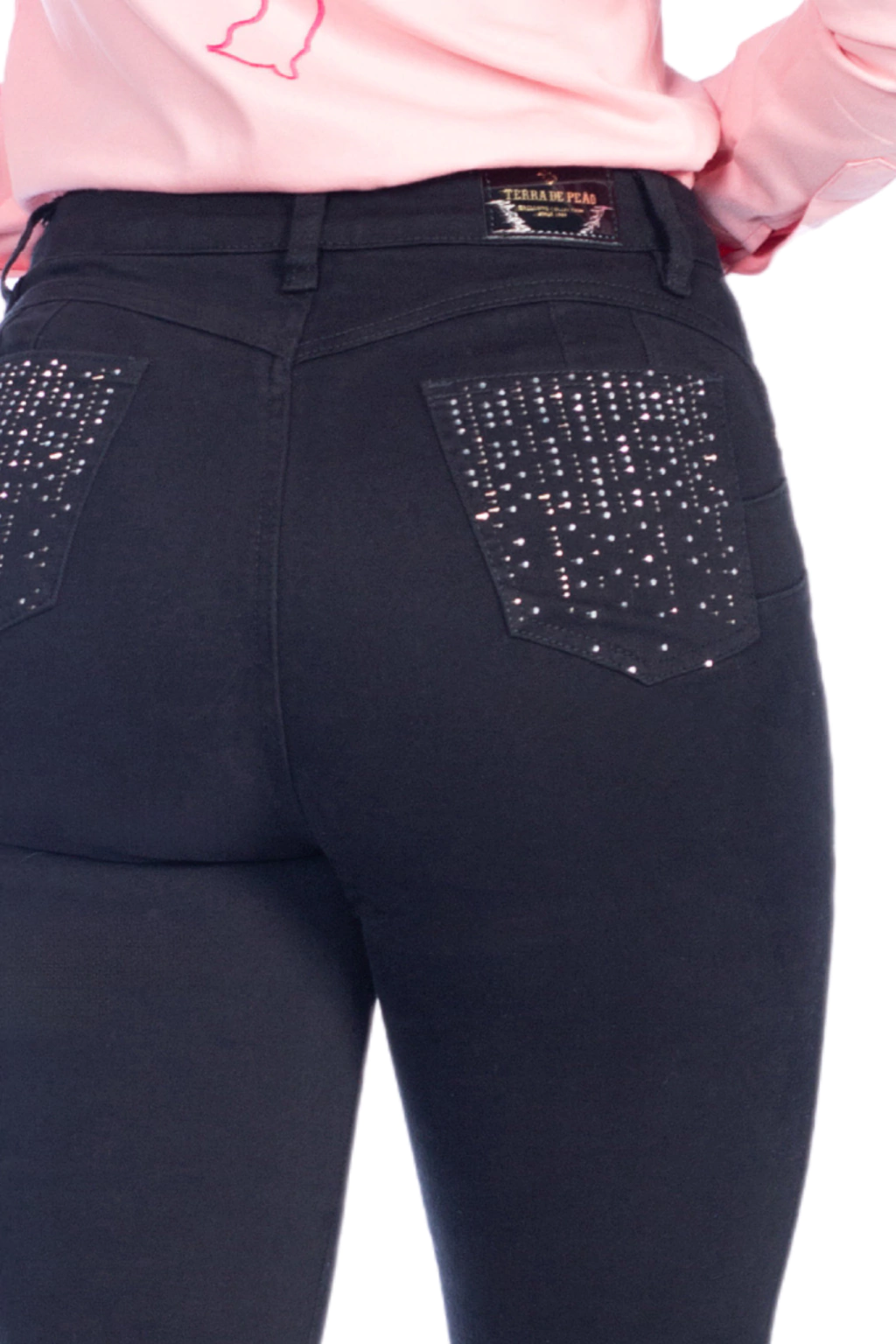 CALÇA FEMININA DE BRIM PRETO COM BRILHOS CHUVA DE PRATA - A Calça Flare de Brim Preto é a escolha certa para quem busca um visual elegante com essência country e toque moderno. Com modelagem flare, ela proporciona um caimento ajustado que valoriza as curvas com sofisticação, garantindo presença marcante em qualquer ocasião.