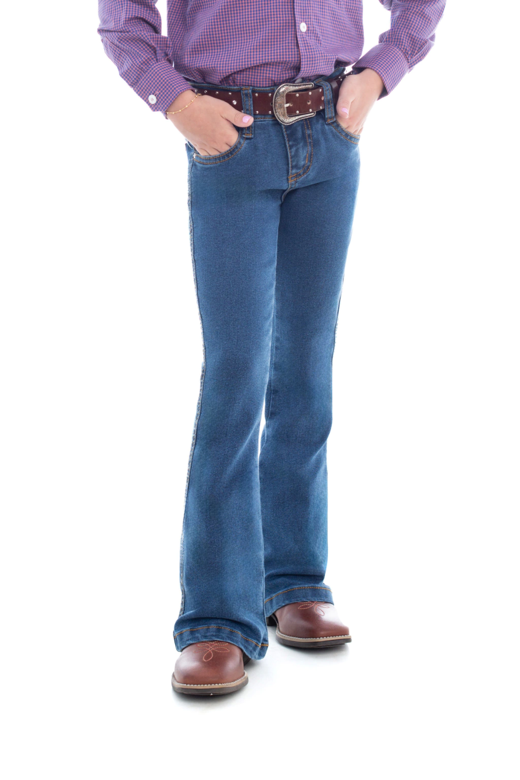 CALÇA FEMININA FLARE INFANTIL - A Calça Feminina Flare Infantil é a escolha perfeita para as pequenas que amam se vestir com estilo e conforto. Com corte flare que se abre suavemente a partir do joelho, ela proporciona um visual moderno e cheio de personalidade, inspirado no universo country e fashion.