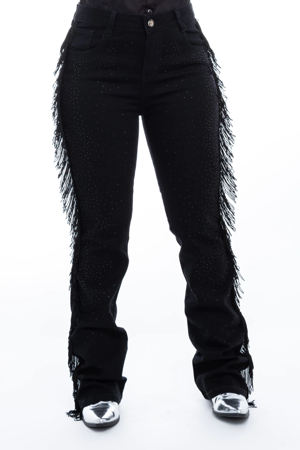 CALÇA PRETA COM FRANJAS - A Calça Feminina Preta com Franjas foi criada para mulheres que desejam unir elegância, atitude e um toque de brilho em um só look. Com modelagem ajustada e tecido de alta qualidade, ela proporciona conforto, flexibilidade e um caimento impecável, acompanhando seus movimentos com leveza e estilo.