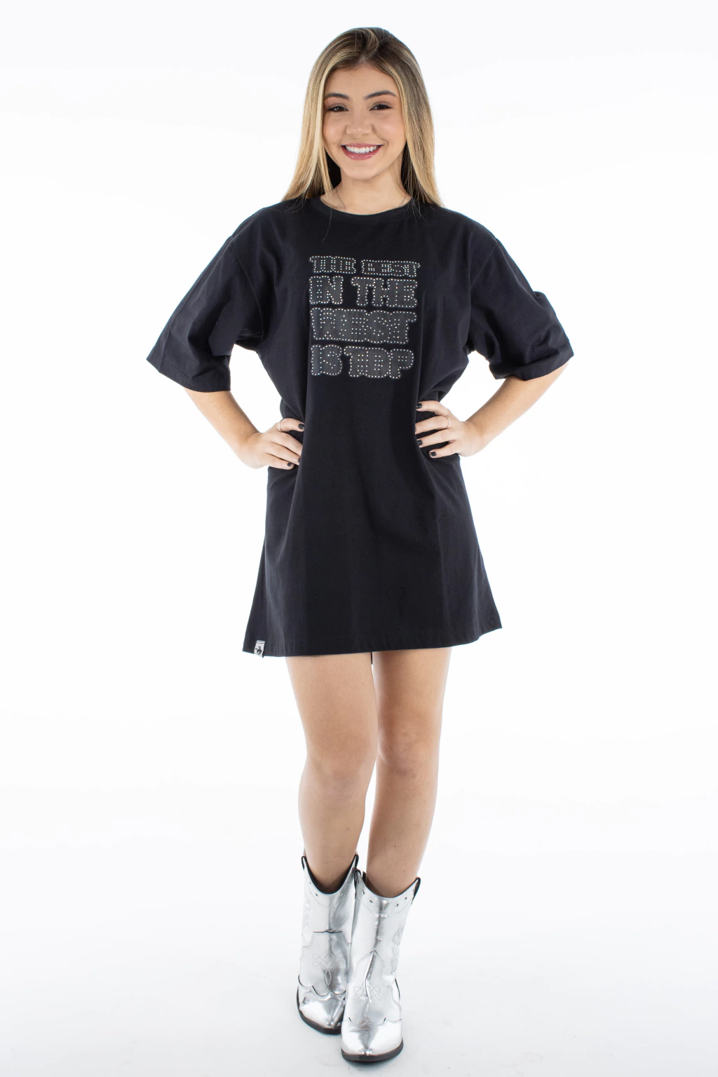 · Cor: Preto com estampa frontal e strass aplicados